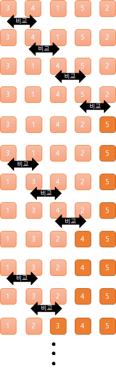 - 이웃한 데이터의 값을 비교해 값의 크기가 다르면 위치를 바꾼다